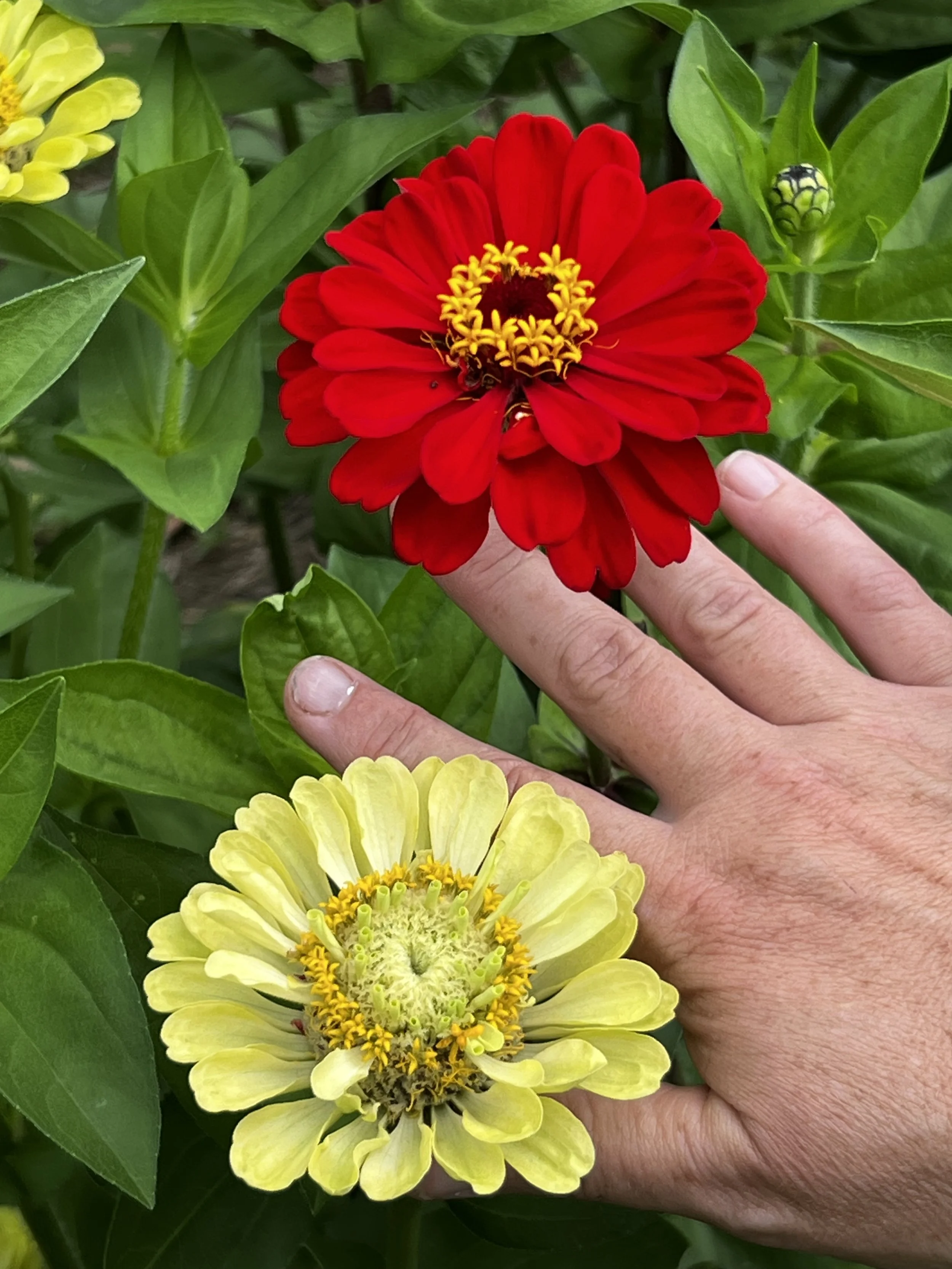 Walking slowly through the vibrant flower beds, with swallowtail butterflies alighting on blooms and hummingbirds collecting nectar, Zinnia Collective members learned the basics of cross breeding. Outfitted with pairs of tweezers and balls of twine, we selected a pair of blooms we thought might benefit from one another. In some cases this meant adding a little pink blush to a Green Envy Zinnia, or mixing pollen from a variegated Whirligig Zinnia with another flower of a solid color.